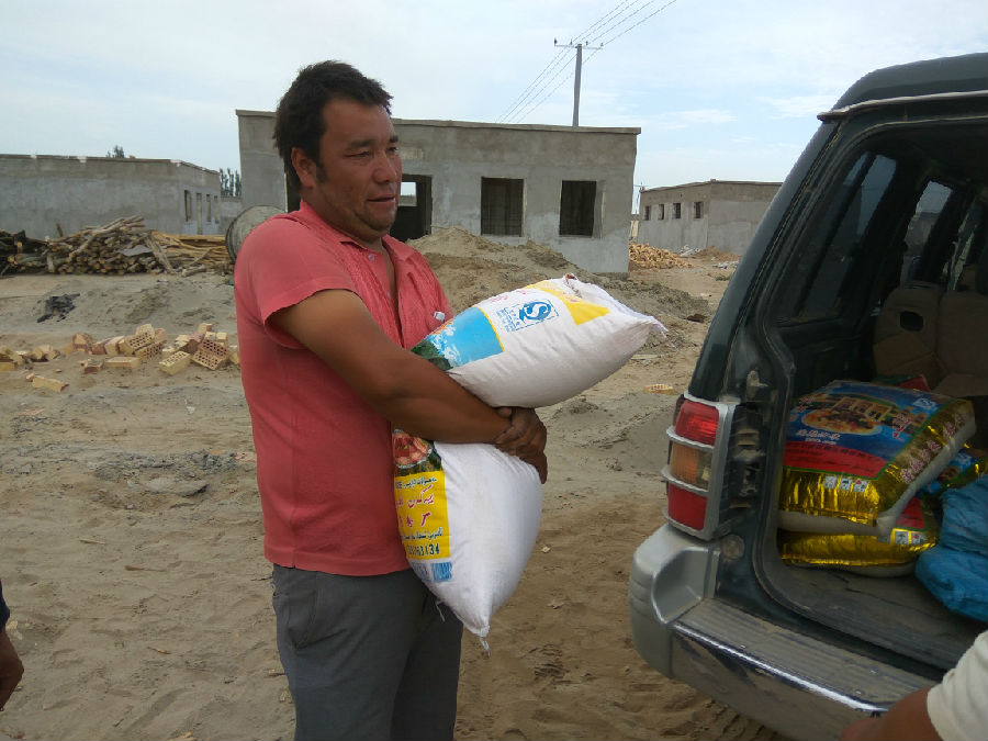 8月14日,自治区残联住村工作组在工作组总领队艾克拜尔?阿布都热依木的带领下,看望慰问在艾力西湖镇建设工地上盖易地扶贫搬迁安置房的20村村民,工作组给他们送去了米、面、油、菜等生活用品。给20村村民带去了工作组温暖的关怀和亲切的问候。工作组总领队艾克拜尔说你们在这安心工作,家里生活上有什么困难都可以给我们工作组说,我们会尽力帮你们解决。村民都十分感谢工作组的关心,表示要努力工作,盖好易地扶贫搬迁安置房。