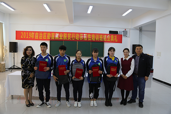 5月7日上午,2019自治区助盲就业脱贫行动示范班结业典礼在新疆残疾人职业中专学校实训楼一楼举办,自治区残联理事长助理郭小力,自治区残联劳动就业服务中心主任秦柱花及学校领导、全体培训班学员及教师参加。