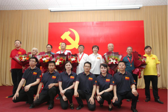 全体重温入党誓词后,新党员为“光荣在党50年”老党员献花并合影留念?;馗刹?、各支部党员也纷纷与6名老党员合影。
