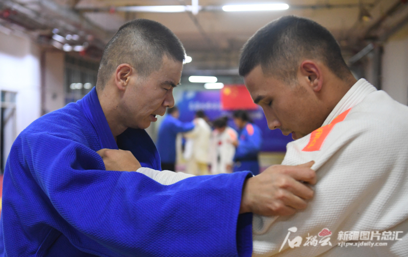 10月13日,新疆盲人柔道运动员夏克尔江·依不拉因(左)与队友进行训练。石榴云/新疆日报记者 韩亮摄