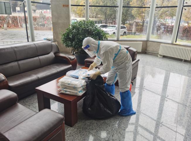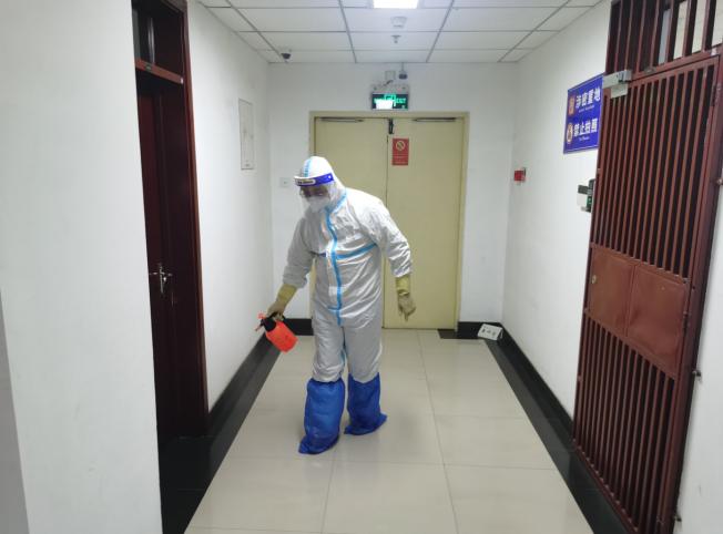 图为周平同志对办公场所进行消杀