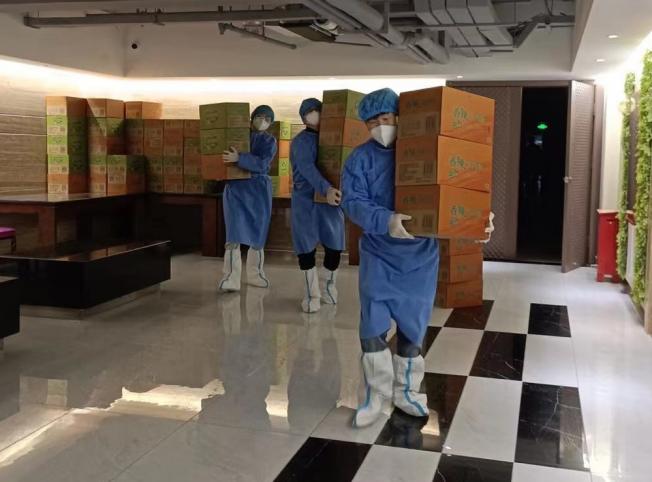 图为党组成员、副理事长王明富,杨成、顾亚霜在援疆医疗队入住点开展志愿服务