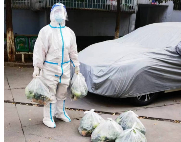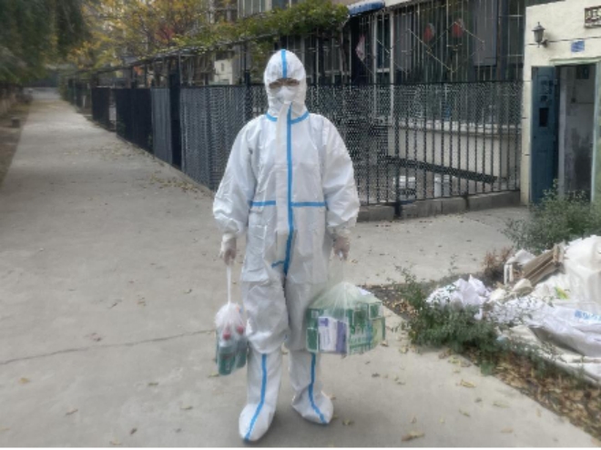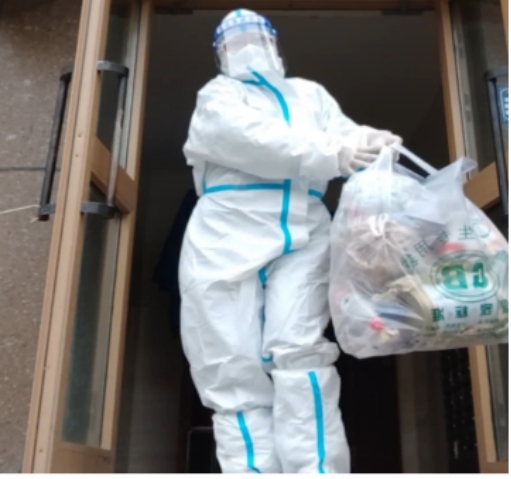 刘婷婷负责小区156户450名居民的生活物资配送和垃圾清运、核酸检测工作。早晚分两次与其他志愿者将物资运送到居民家中,中午对全楼的垃圾进行清理,每日凌晨要上门进行核酸采集,除此以外,还要帮助居民买药、买水、买电等。