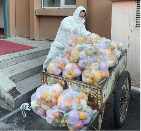 图为自治区残联中专学校胡杨为小区居民配送水果包