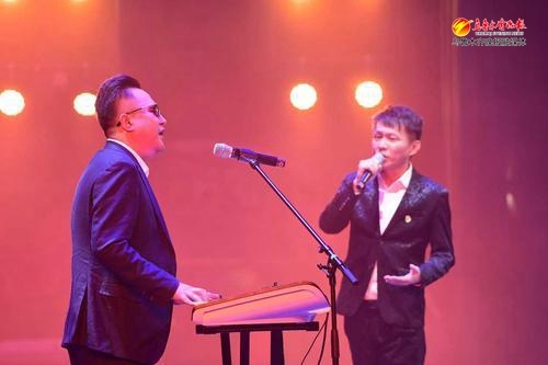 演员达吾然·肉斯坦木和安明亮正在演唱歌曲《永远在一起》。记者梁淑芳摄
