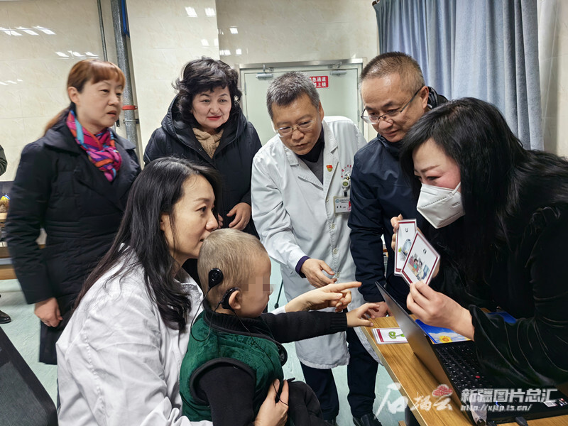3岁的小伊力(前左二)在医生怀中练习发音。自治区残联及医护人员观察着他的反应。石榴云/新疆日报记者 管梦颖摄