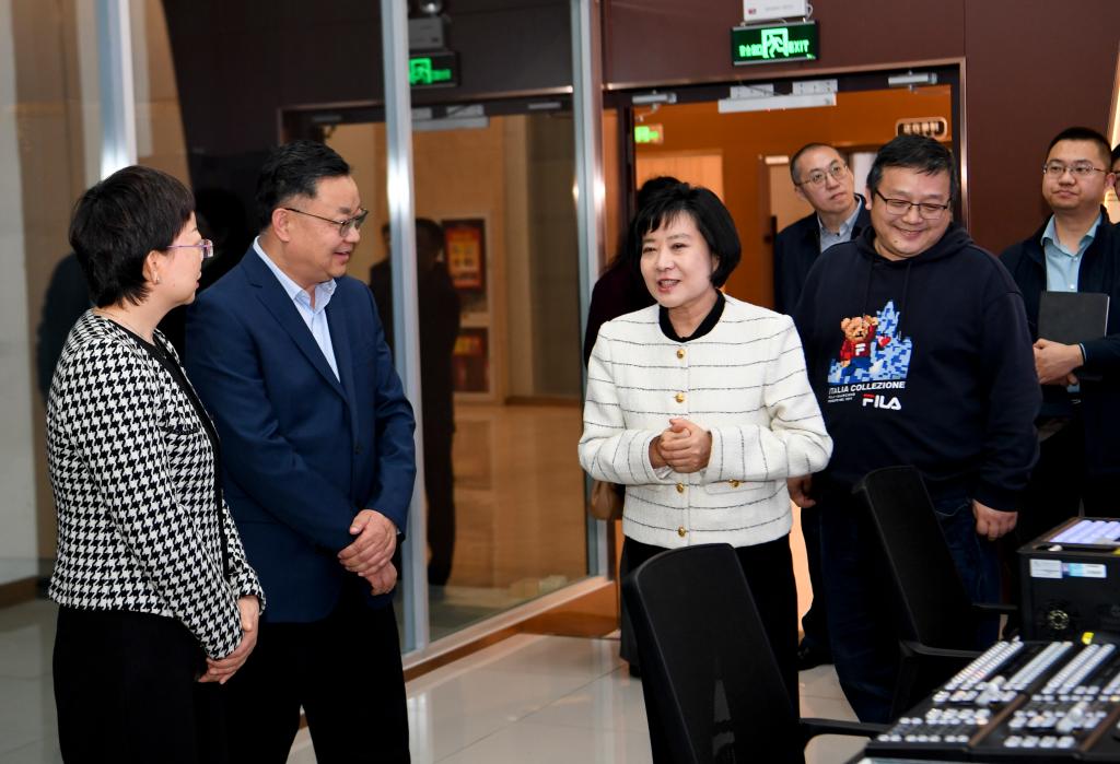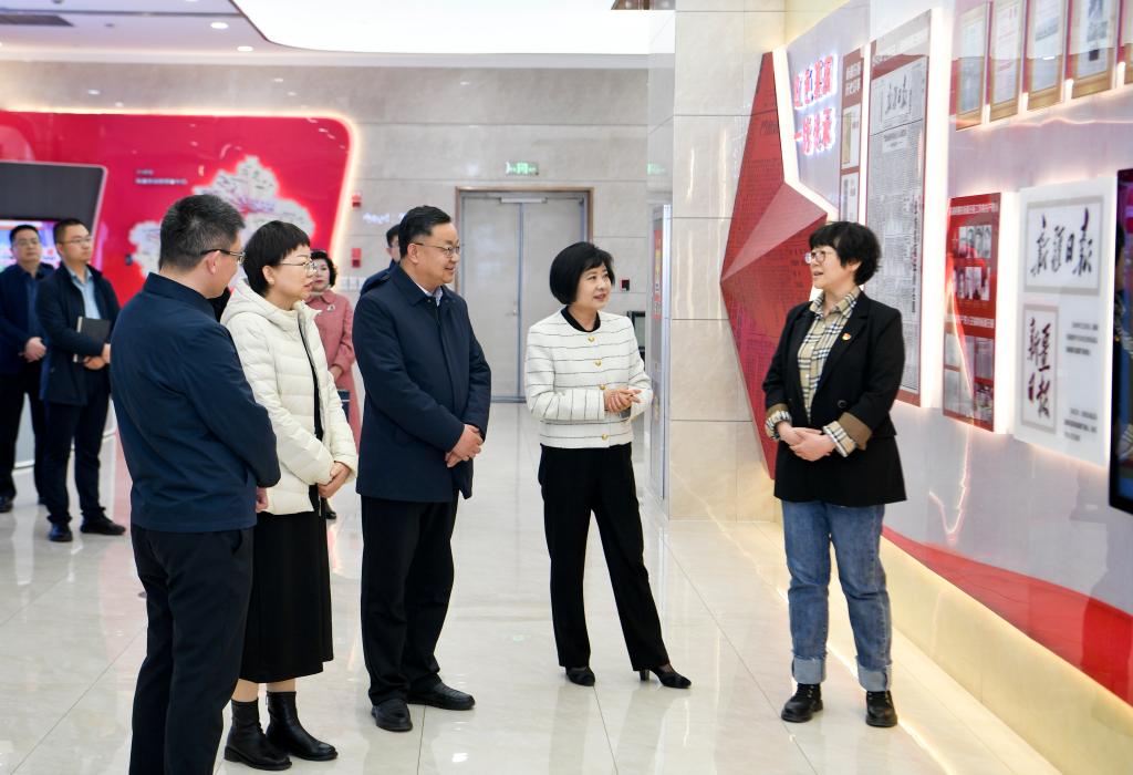 夏建新一行先后参观了新疆日报社报史展览馆、新闻演播厅和新闻发布厅,实地了解了天山网、融媒体技术平台、学习强国新疆学习平台和石榴云客户端运营情况。