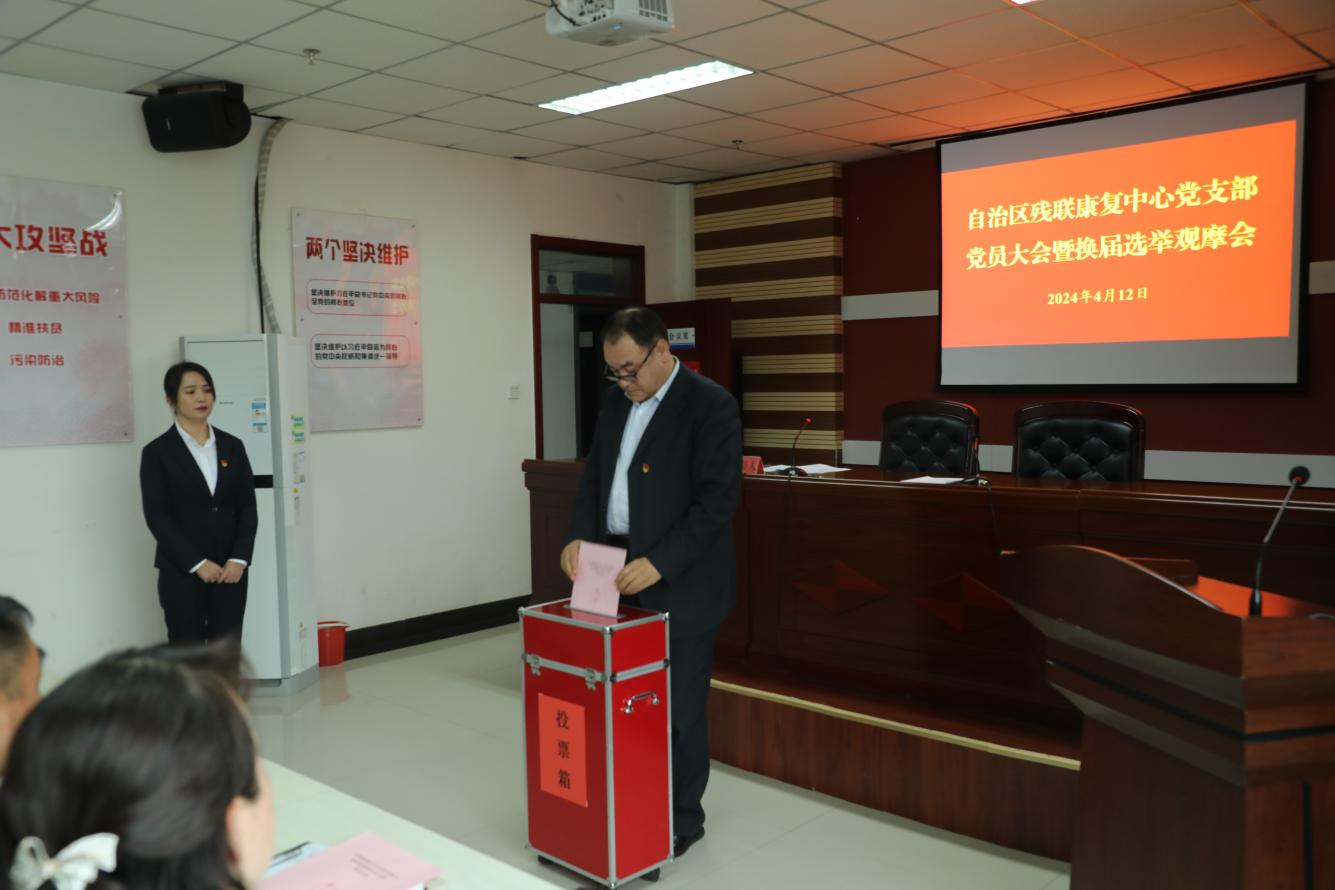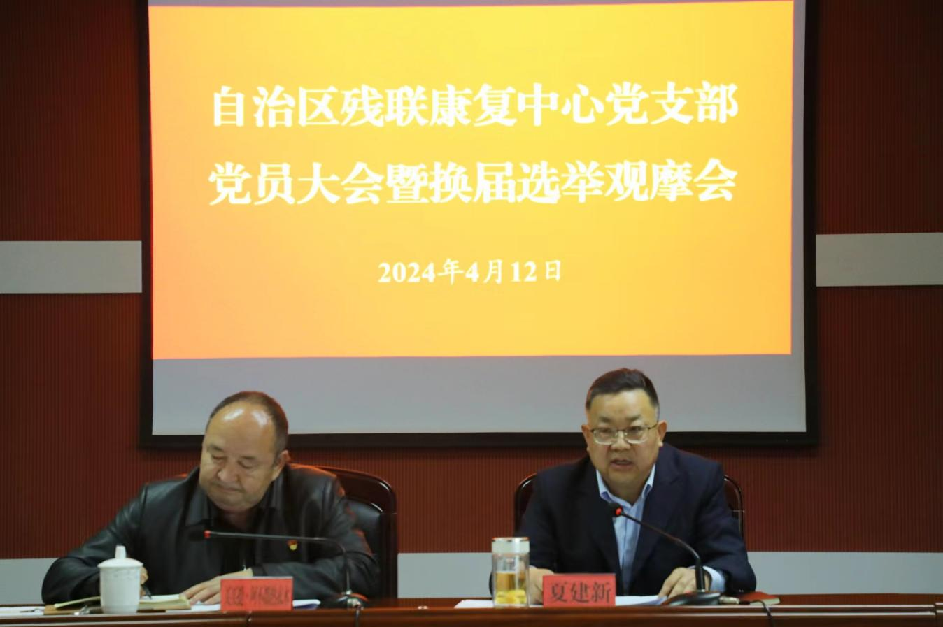4月12日下午,自治区残联组织召开康复中心党支部党员大会暨换届选举观摩会,党组书记、理事长夏建新,党组成员、副理事长买买提·阿不都热衣木参加会议。