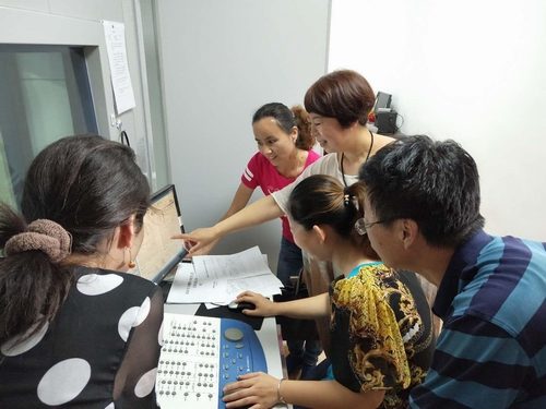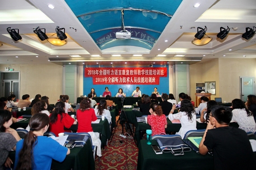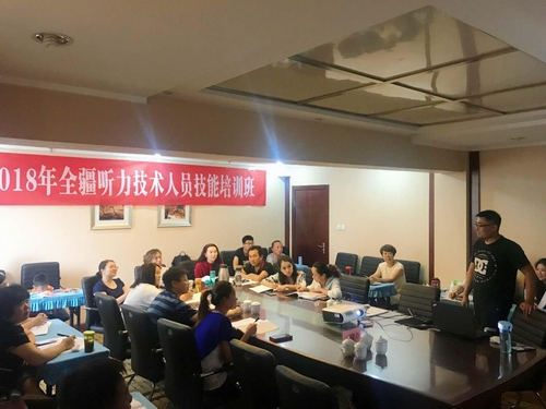 7月9日-15日自治区残联康复中心在乌鲁木齐举办了“2018年全疆听力语言康复教师教学技能培训班”和“2018年全疆听力技术人员技能培训班”,自治区残联副理事长热依汗·依沙木丁、自治区残联康复部副部长朱禾、中国听力语言康复研究中心听力门诊部副主任医师王晓力、上海聋儿康复中心专家王文迪出席培训班开班典礼,新疆残疾人康复服务指导中心主任阿布来提·铁木尔主持开班仪式。