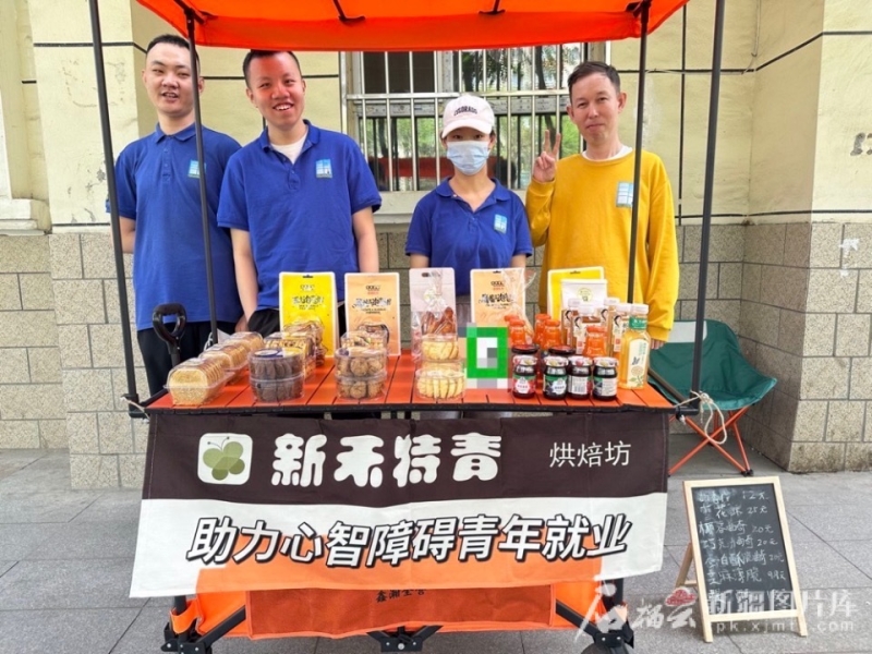 5月16日,在乌鲁木齐市友好南路新疆大公馆附近,新禾特青烘焙坊的几位心青年(心智障碍青年)正摆摊出售店里制作的食品。