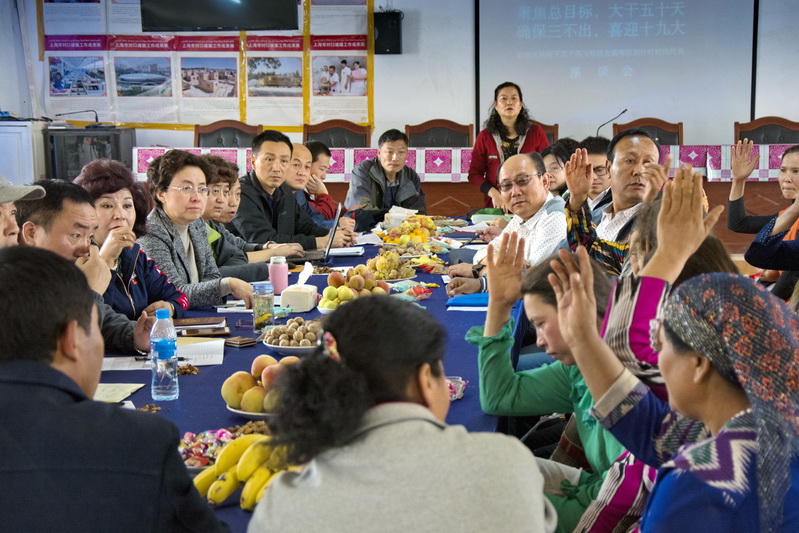 10月3日上午,按照入户走访计划,张海燕带领干部们分成6个组分头开展入户走访,实地了解村民特别是特殊群体的实际困难,直接到田间地头帮助群众拾棉花、收割玉米。同时,有针对性地开展思想教育工作,向群众宣传党的好政策,引导群众爱祖国、感党恩、听党话、跟党走?!扒岸问奔渥灾吻辛橹颐堑轿诼衬酒胩角?、参观、学习,让我看到了外面的世界,工作队的干部还经常到家里来看我,今天张书记又带着一群干部从乌鲁木齐远道而来帮助我掰玉米,亲兄弟都没有对我这么好,感谢党、感谢政府,我以后一定教育好子女,让他们听党的话,不做违法的事”,在喀拉加什村村民代表座谈会上,麦合木提·司迪克激动得热泪盈眶。