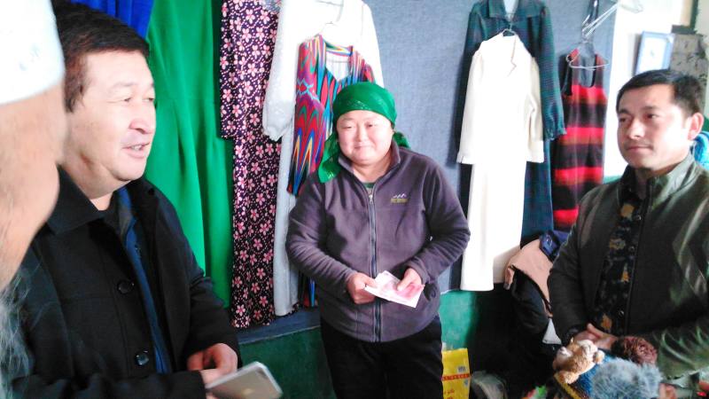 图为阿帕尔·吾甫尔向贫困残疾人送上慰问金