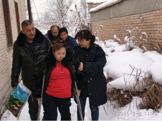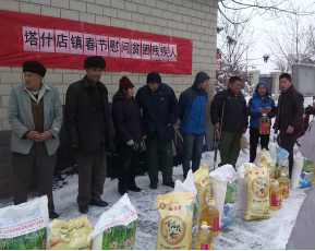 在新年即将到来之际,库尔勒市残联统一开展对贫困残疾人进行春节慰问活动,塔什店镇党委、政府积极协调镇残联、镇民政、镇红十字会共同开展活动为贫困家庭送温暖、送祝?;疃舜位疃蛴蚰诘某陆?、吐尼亚孜·才多力等56名贫困残疾人进行了慰问,镇领导们顶风雪踏炎寒对包联的贫困户进行慰问,及时把慰问品(米、面、油)送到残疾人家庭及残疾人的手中。通过此次慰问活动体现了各级党和政府对贫困残疾人的关怀,使他们真切的感受到党和政府的关爱与温暖,幸福愉快的度过新春佳节。