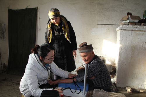图为住村工作组成员王晓丽上门为上户镇直属一村村民量血压