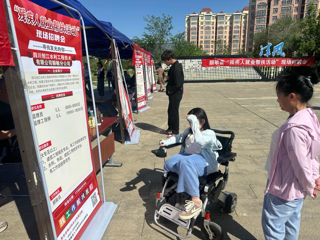 5月16日,额敏县残联联合县人社局等单位在清风广场举办“残疾人就业帮扶”现场招聘会?;疃浴胺霾兄泄泊倬鸵怠蔽魈猓?5家用人单位参与,提供305个岗位。