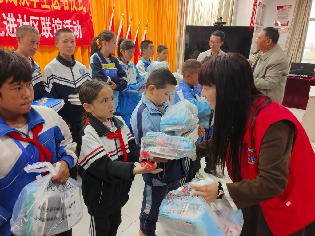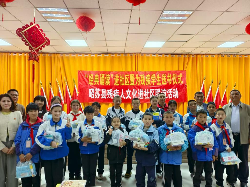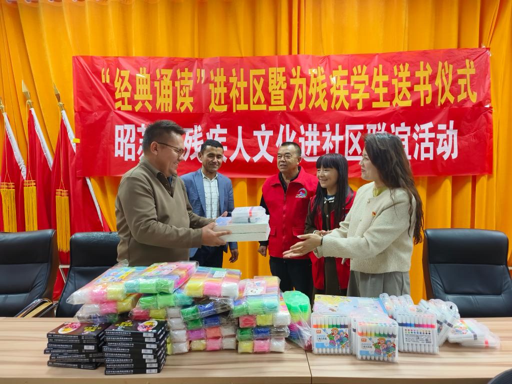 9月18日,昭苏县残联联合教育局、工矿路社区开展“经典诵读”进社区暨残疾人文化进社区活动,以文化为桥梁,将铸牢中华民族共同体意识融入全过程,为30名残疾学生集中发放四大名著、学习用品大礼包、爱心购书卡,并向社区捐赠文化用品。社区居民代表、残疾学生及教师、残联与社区工作人员齐聚,共谱文化团结乐章。