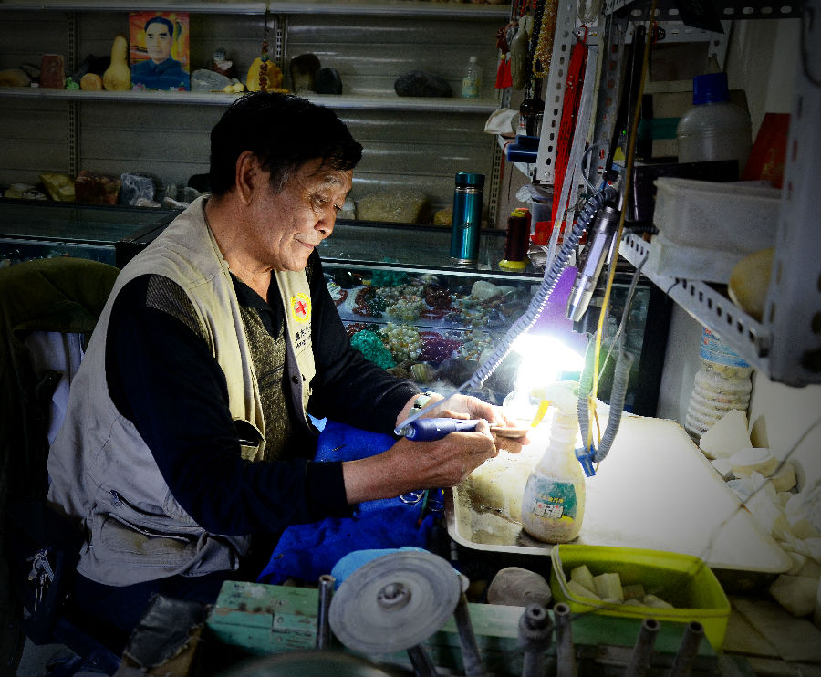 然而,丁广高发现玉雕销售渐渐火爆,爱学习的他又报名参加了县残联举办的玉雕技术培训班。记者在他的店里看到一件件精美的玉器成品,不禁赞叹道:“真是心灵手巧!”丁广高坐在磨石机前,将一颗颗形状各异的“顽石”打磨出光泽。他告诉记者,每一件玉雕作品,都需要石匠在制作过程中根据不同玉料的天然色泽和自然形状,经过精心设计、反复琢磨,雕刻成精美的艺术品。这需要经过长时间的练习,才能掌握。现在,丁广高仍不满意自己的雕刻技术,还在努力地练习刀法。