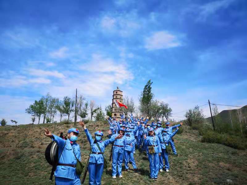 图为康复中心全体教职工在“宝塔山”下胜利会师