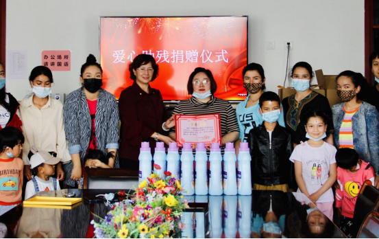 本次捐助活动中,新疆乌鲁木齐翼成中晟商贸股份有限公司、广州众欣国际新疆分公司联合新疆雷锋·残疾人志愿者服务队共捐赠洗衣液10箱,总价值3000余元,康复中心将陆续发放给中心在训残疾儿童家庭。