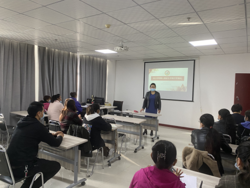 图为康复中心听力语言康复科阿依孜木古丽科长在开学典礼上讲话