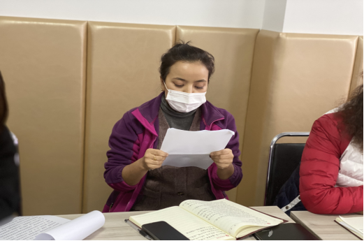 图为依丽米努尔老师、麦菊丹教师等正在交流发言