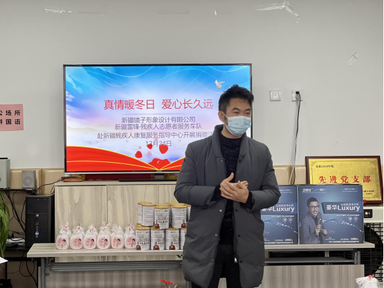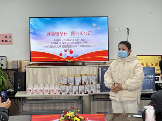 学习党史,重在力行,关键是牢记宗旨办实事。今年以来,新疆残疾人康复服务指导中心(简称康复中心)把开展“我为群众办实事”作为检验党史学习教育成效的试金石,把贯彻落实十九届六中全会精神与党史学习教育相结合,将工作落到实处,努力做好残疾人关心关爱工作。12月24日,康复中心党支部与新疆镜子形象设计有限公司、新疆雷锋·残疾人志愿者服务车队共同开展《真情暖冬日·爱心长久远》捐赠活动??蹈粗行氖榧锹榔肌⒅魅沃旌?、新疆镜子形象设计有限公司董事长马福全、新疆雷锋·残疾人志愿者服务车队赵爱华队长、东泽空间思维新疆分校校长刘保岐及中心教师、残疾儿童和家长代表40余人参加了此次捐赠活动。