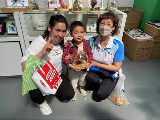 参观活动结束后,每位教职工和自己的结对家庭一起制作了标本手工艺品,你来插上红的花,我来帮助孩子撒上一些小绿苗;大家你一言我一语,共同感受着创作的快乐。工艺品做好后,中心教职工和自己的亲戚共同合影留念,都对自己和他人的作品赞不绝口。
