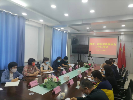 图为在博州残联各定点机构负责人就近期康复工作的现场报告会议
