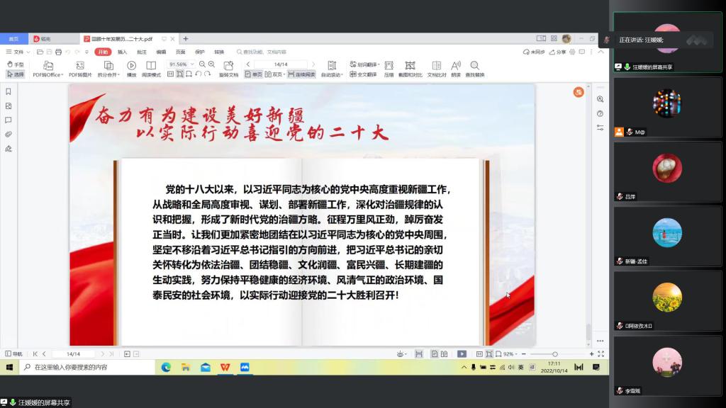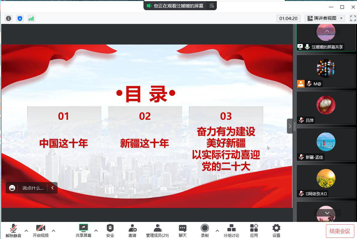 在党的二十大召开之际,新疆残疾人康复服务指导中心青年工作委员会在线开展“回顾十年发展历程,喜迎党的二十大”微党课活动,中心全体党员及青年共计29人参加了本次活动。