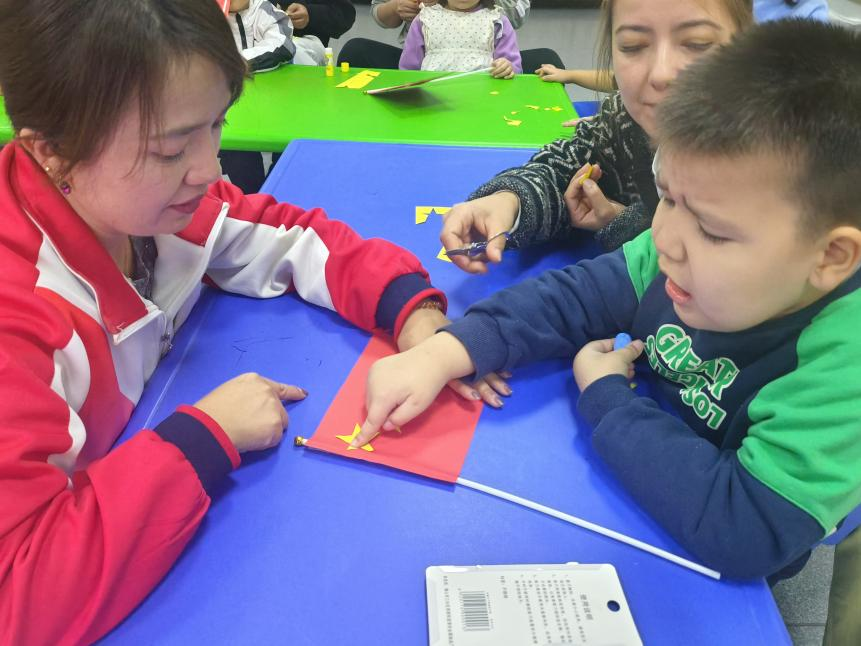 活动分为两个部分,第一部分为国庆主题教学??蹈唇淌νü薪蔽蚀鸬男问接朐谘倒露乐⒅橇φ习凹页す餐私夤旖诤椭星锝诘睦蠢?。第二部分为康复老师带领孩子们共同表演舞蹈《国旗国旗真美丽》,并伴随着优美的音乐旋律,大家一起制作五星红旗、一起做灯笼、做月饼,现场其乐融融,亲如一家,共同体验着主题教学活动带来的快乐。