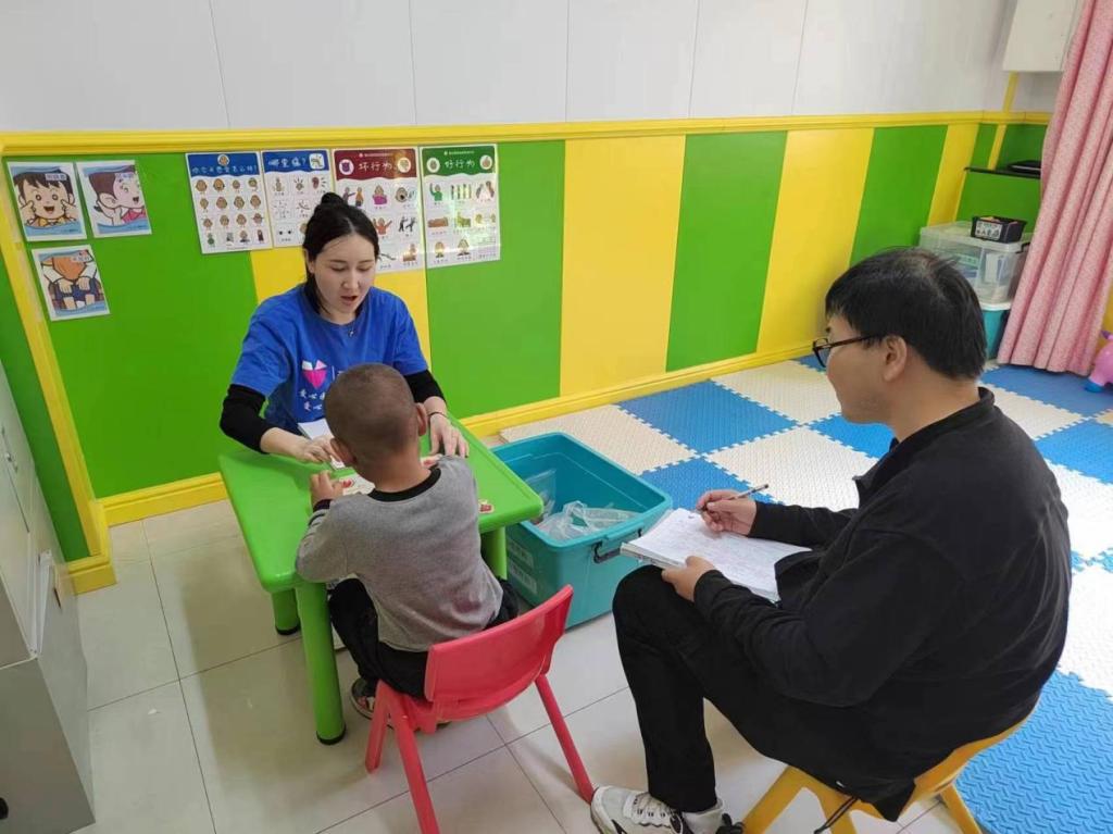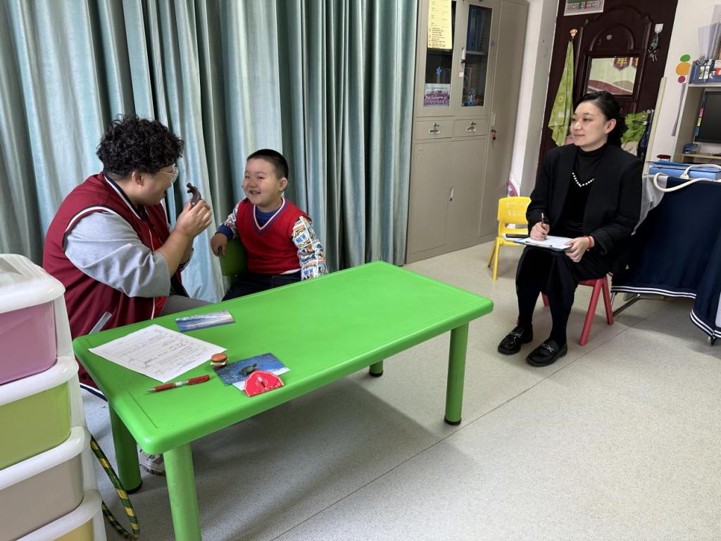图为评估人员在爱心园特殊教育中心进行个别化教学指导