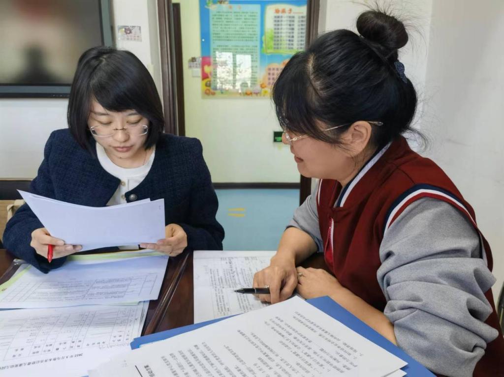 图为评估人员在爱心园特殊教育中心查阅康复档案
