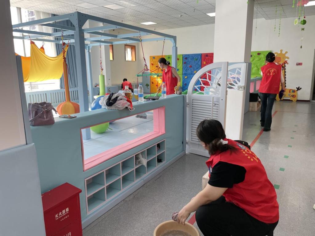活动中,志愿者们先参观了康复中心智障和孤独症儿童康复训练场地,随后协助康复教师对训练场地进行深度清洁与消毒,为新学期孩子们打造卫生、明亮的学习空间。