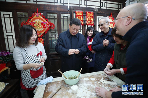 草厂胡同过去居住条件比较差,如今经过改造后,居住环境大为改善,体现了“老北京新气象,老胡同新生活”。习近平先后走进两个居民院落,了解老城区改造后居民住房条件改善情况。看到总书记到来,大家都很激动,纷纷向总书记问好。习近平仔细询问他们日子过得怎么样、冬天用什么取暖、每个月的电费要多少、年货备齐没有,祝愿他们生活幸福。居民侯雅明现场写下一副春联,给总书记拜年。习近平高兴地拿起一幅“?!弊郑鬃蕴矫派?,给这里的老街坊们拜年。习近平表示,中国共产党的追求就是让老百姓生活越来越好。在朱茂锦家,习近平同他们一家人包饺子、炸饹馇、聊家常。大家告诉总书记,这些年,老城区改造后居住条件和生活环境大为改善,大家衷心感谢共产党。习近平强调,党中央十分关心老城区和棚户区改造,就是要让大家居住更舒适、生活更美好,解决好大家关心的实际问题,让大家住在胡同里也能过上现代生活。