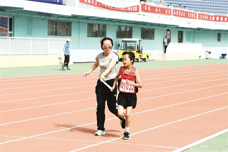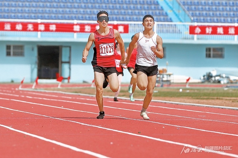 9月10日,乌鲁木齐代表队盲人运动员玛依热·阿布都乃比在引导员贾苗苗的协助下向前奔跑。
