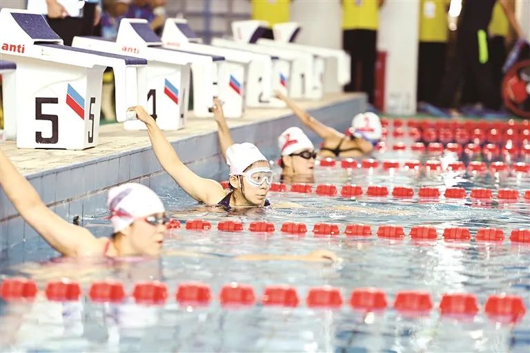 9月10日,自治区残特奥会游泳比赛开赛。图为运动员们在起点蓄势待发,力争取得好成绩。 记者 薛云少 摄