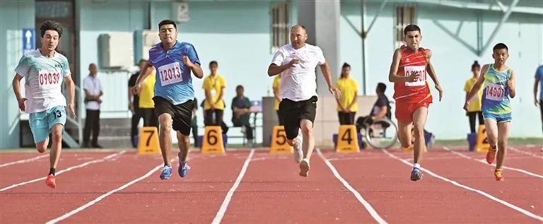 9月10日,自治区残特奥会田径比赛在巴音体育场举行。图为当天上午举行的男子T12-13100米预赛现场。 记者 确·胡热 摄