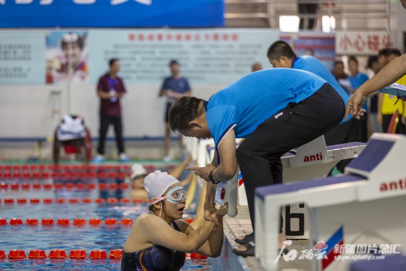 9月10日,射箭冠军王燕红(左)在S6-9级女子50米自由泳的比赛中完成跨界游泳的首秀,受到教练的赞许。石榴云/新疆日报记者 唐堪东摄