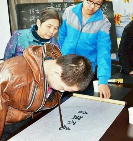 褚长昊12岁时用牙齿咬着毛笔学习书法 资料图片