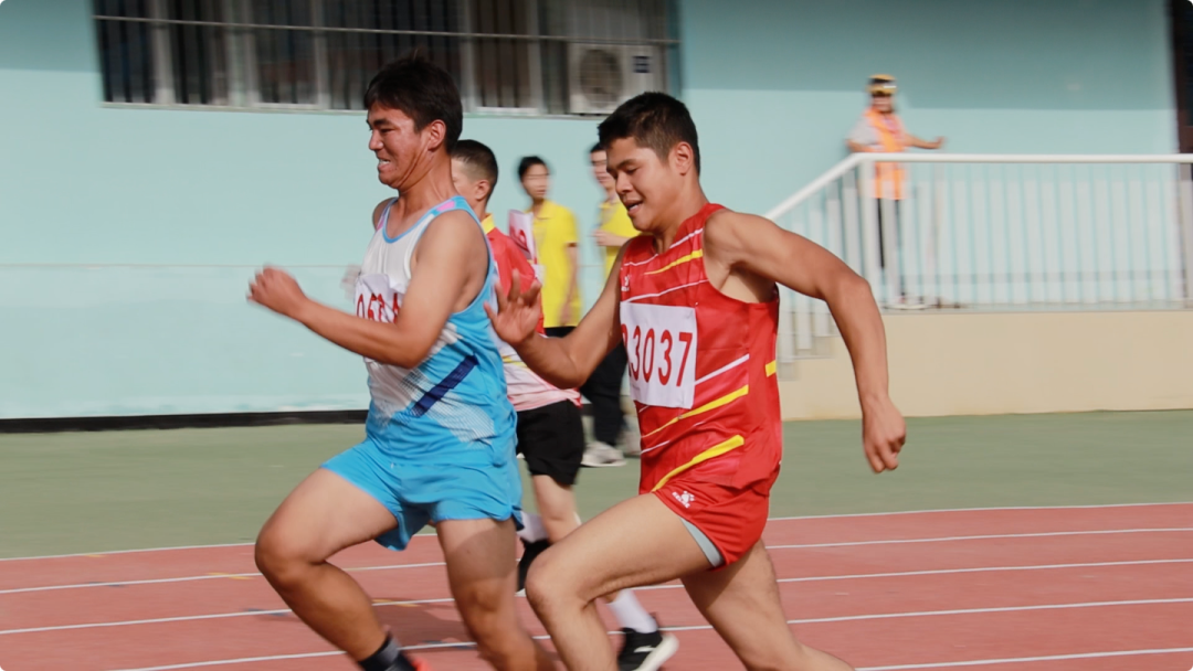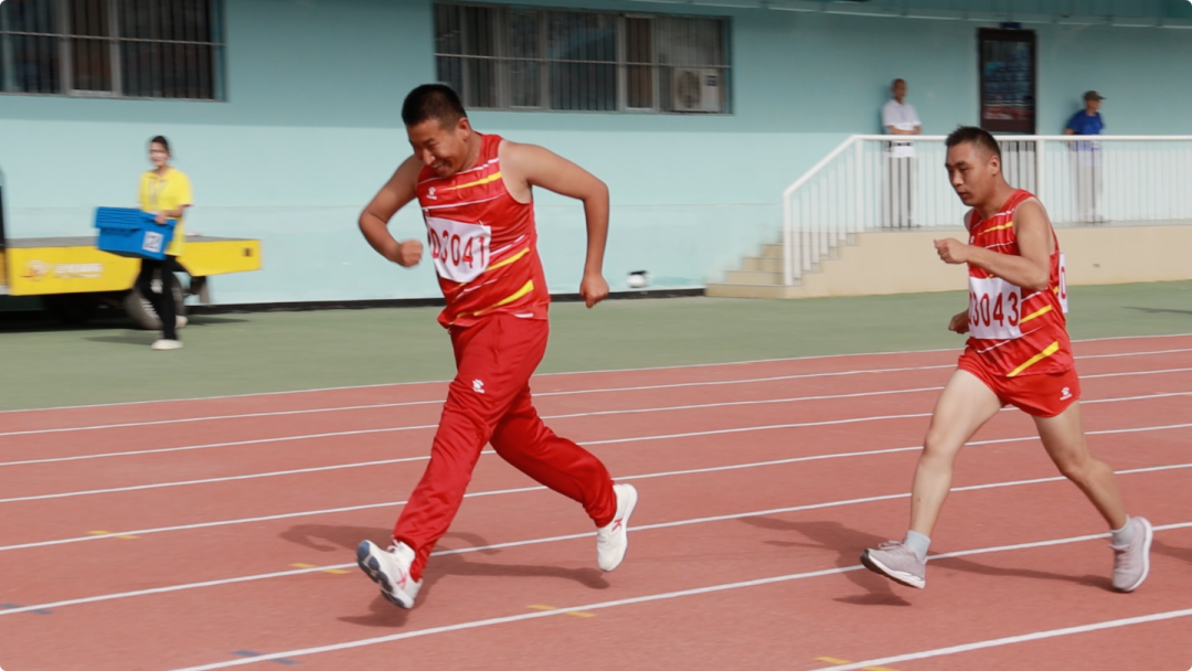 图为伊宁市选送的阿不来海提·阿不都许(图右)参加特奥会男子100米第4组决赛荣获金牌。高莘荑 摄