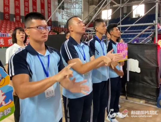 来自新疆残疾人职业中专学校的35名运动员静静肃立,他们有的放声齐唱,有的用手语“唱”国歌,动作干净利落,时而将双手高举过头顶,时而用手指在胸前围成心形,眼神充满坚定。
