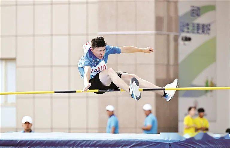 9月10日上午,自治区残特奥会田径比赛在巴音体育场进行男子F60跳高决赛。图为选手在跳高比赛中。记者 确·胡热 摄