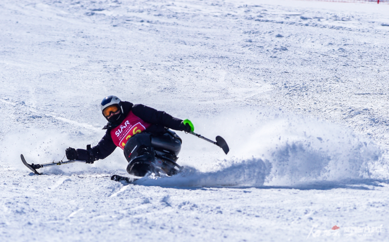 3月5日,一名参赛选手在坐姿高山滑雪速降比赛中。石榴云/新疆日报记者 周鹏摄